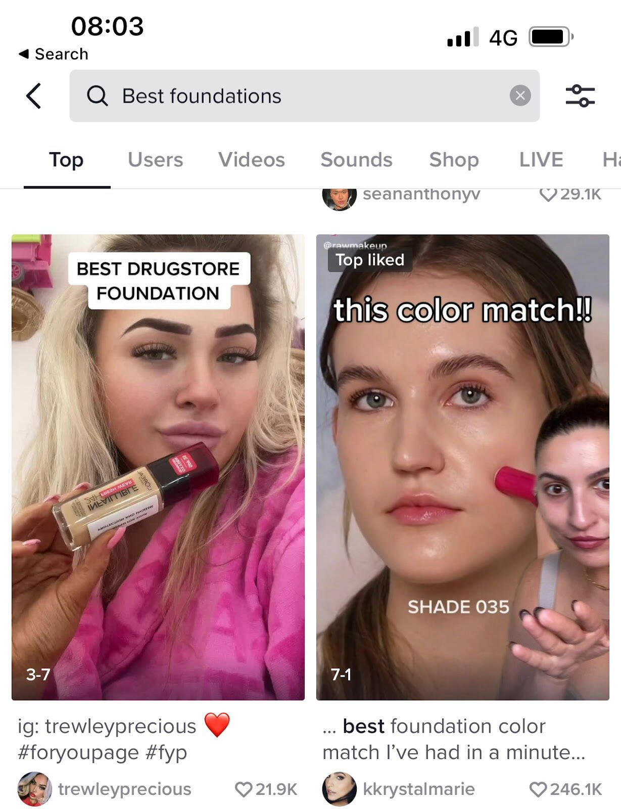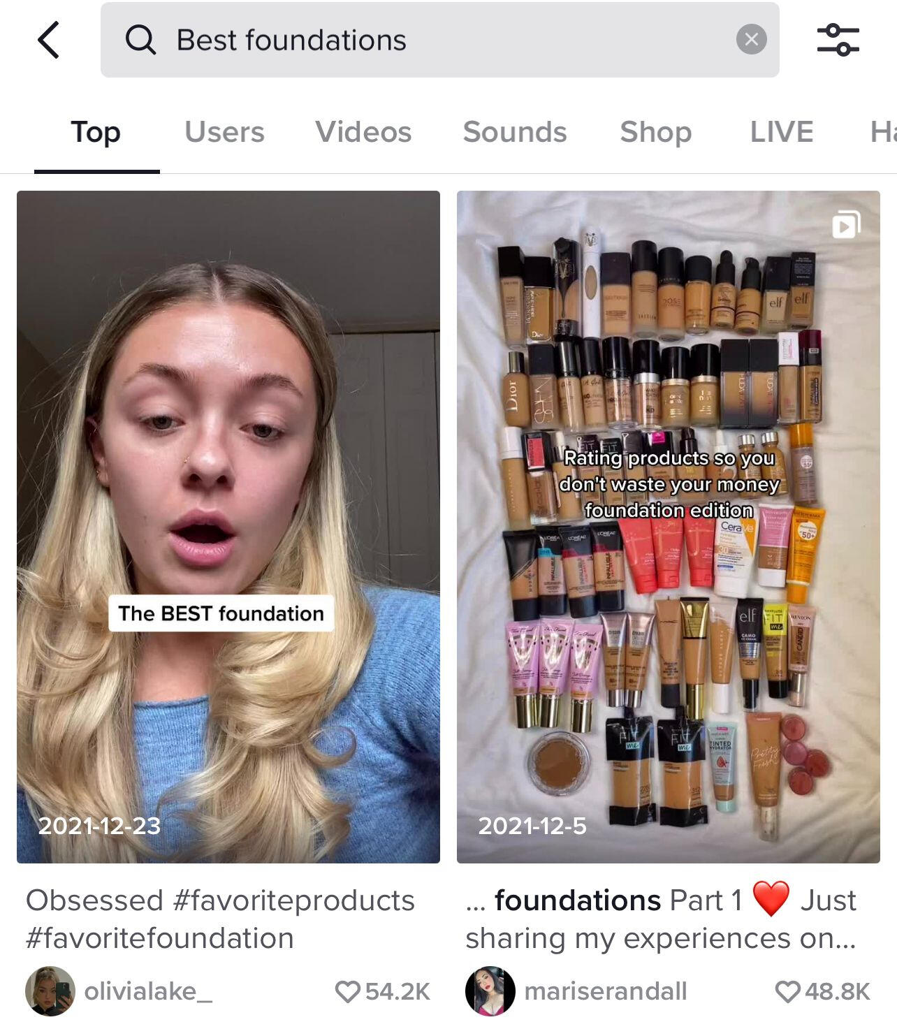 When you create a video, you can add text to the screen. TikTok reads this text and serves the user your content based on any keywords mentioned.We recommend adding keywords into your text on screen, specifically within the first 1-5 seconds of the video.As you can see here, when searching for "best foundations", the video that ranks first is a video with "best foundations" as the keyword text added to the screen. Note that "best foundations" isn’t mentioned within the caption, showing how powerful in-video text is on rankings.